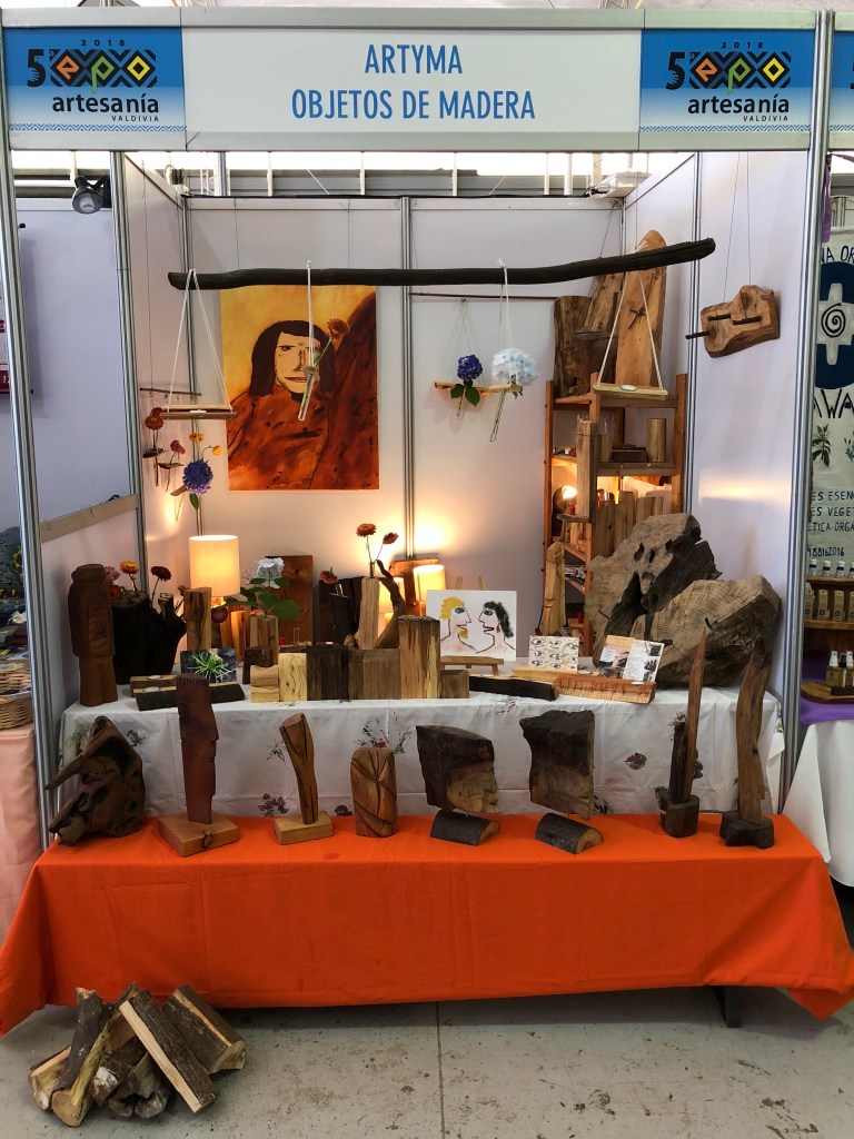 Kurz konnte ich am Morgen vor Ausstellungsbeginn einen anderen Höhepunkt des diesjährigen Sommers – auch hier im Parque Saval – besuchen, die jährliche Arbeit namhafter Skulpturkünstler. Das Material wird von der Stadt gestellt und jeder bringt sein Werkzeug mit. Eine Skulpturturarbeit an einem großen Holzstamm hätte mich schon sehr gereizt. Erfahren habe ich aus einem Gespräch mit dem chilenischen Künstler Victor Pons aus Temuco, dass es spezielle Schleifscheiben mit Kupferbeschichtung gibt und das ganze Holzstämme nicht viel teurer sind als ein gesägtes Brett aus nativem Holz.